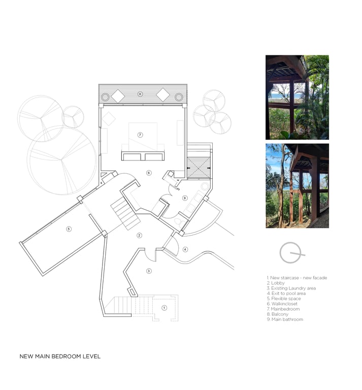 The main house´s deck is supported by 9 columns, leaving a height of 7 meters from the ground. While the house was being renovated, the owner realized the potential of the space below the deck. an open area with concrete columns, ocean views and enough space available to add a main bedroom to the ongoing renovation. Designing from the inside out each space leads to an ocean view. The project included the addition of a new master bedroom, master bathroom, walk-in closet, terrace, and a versatile room designed to serve as both a bunk bedroom and an office.